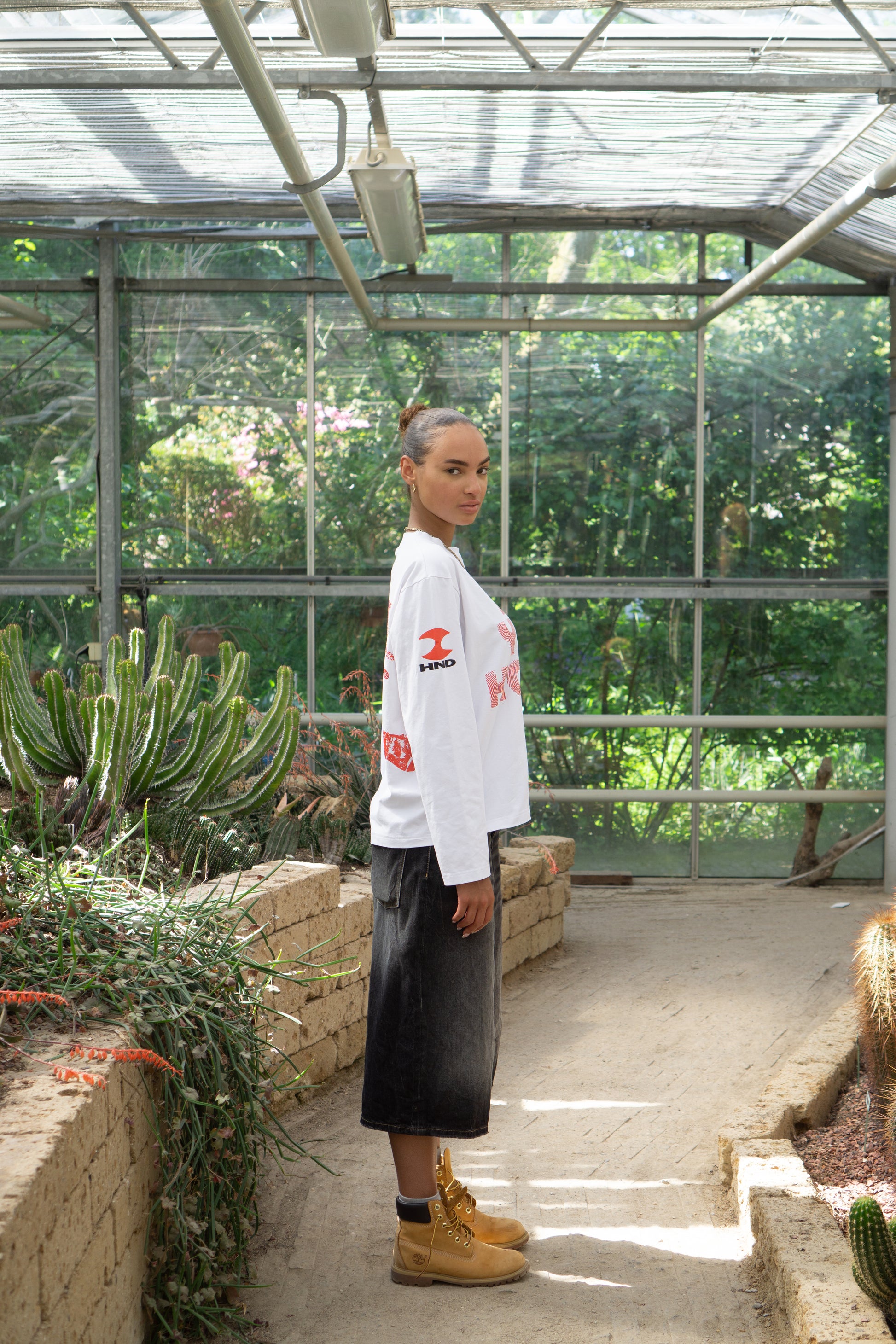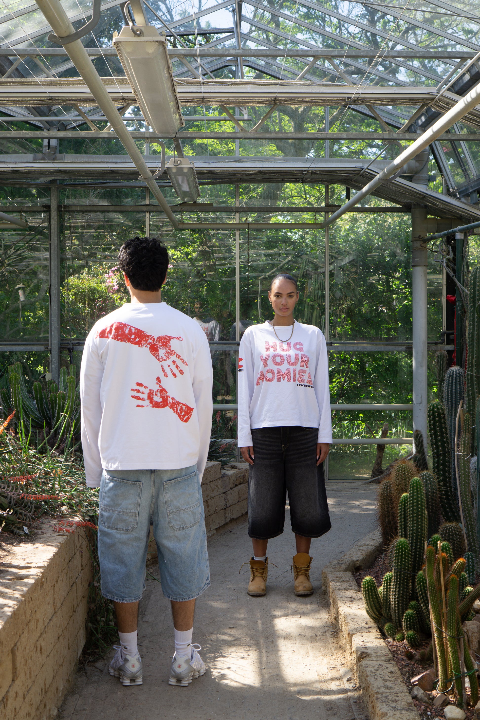Sometimes a hug says more than words ever could. The Hug Your Homies Long Sleeve is a tribute to connection, love and vulnerability. All wrapped up in a raw streetwear statement. This white long sleeve features a bold “HUG YOUR HOMIES” graphic in red fingerprint texture on the front, a subtle black HY N DRY logo just below and a red/black HND logo on the right sleeve. On the back: two figures caught in an embrace.